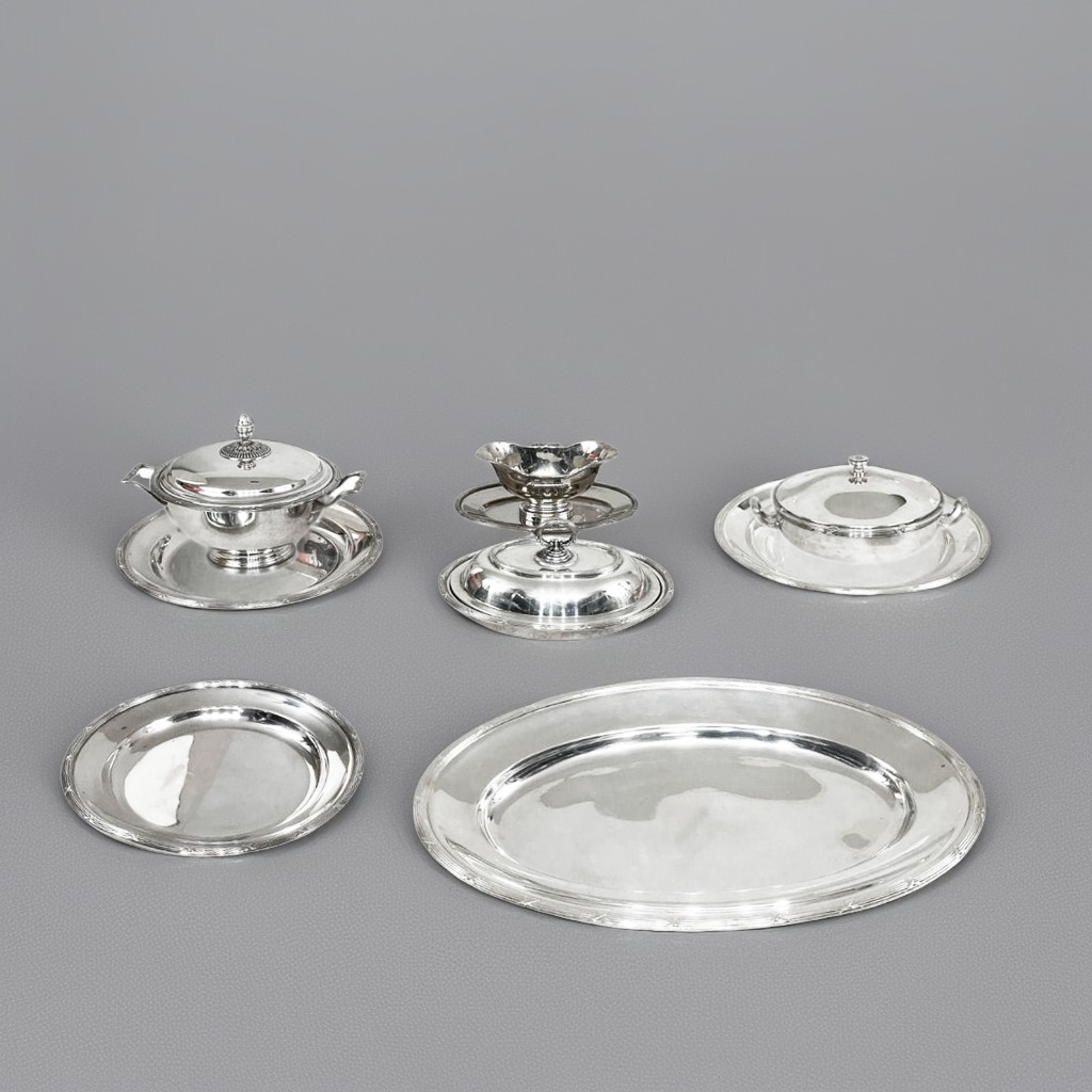 Imagem: Conjunto em prata da tradicional manufatura brasileira Fracalanza, composto por 8 peças. Fundada em 1884, em São Paulo, a Fracalanza destacou-se como uma das principais fabricantes de pratarias e metais nobres do país, símbolo de elegância e qualidade no serviço à mesa. Acervo Arve.