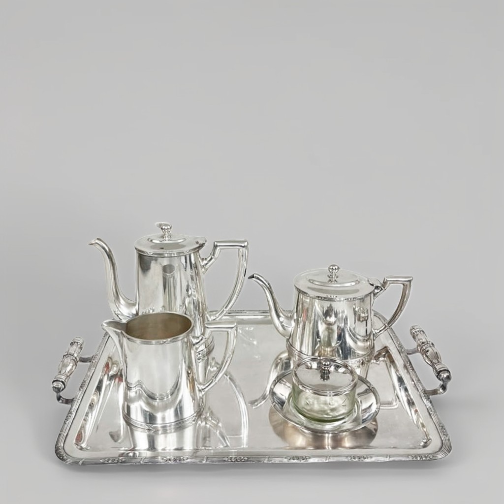 Imagem: Conjunto Wolff composto por bandeja, bule, chaleira, leiteira e manteigueira, produzidos em metal com banho espesso de prata (Prata 90), técnica que garante brilho duradouro, resistência e acabamento refinado. Fundada no Brasil no início do século XX, a Wolff é reconhecida como uma das mais tradicionais marcas de prataria do país. Acervo Arve.
